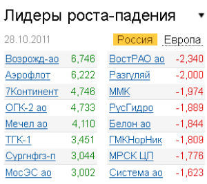 Хорошая отчетность продолжает поддерживать спрос в акциях банка "Возрождение", и по итогам дня бумаги выросли на 6,75%. Кроме того, в течение дня повышенным спросом пользовались акции "Аэрофлота" (+6,22%), ОГК-2 (+4,73%) и "Мечела" (+4,11%). Хуже рынка закончили день бумаги "Разгуляя" (-2%), "Норникеля" (-1,81%), ММК (-1,97%). Поводом для снижения котировок последнего послужила отчетность по РСБУ за 9 месяцев текущего года, которая зафиксировала чистый убыток компании в размере в размере 15,181 миллиардов рублей. Заключение соглашения о сотрудничестве с корейскими компаниями не поддержали акции "РусГидро", которые по итогам дня "похудели" на 1,89%.