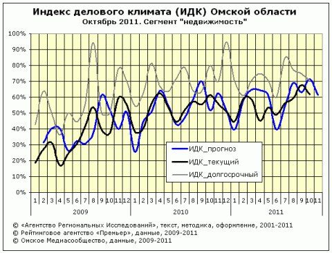 В октябре 2011 года омский Индекс делового климата в секторе "недвижимость" снизился на 6 ступенек - до 62%. Значительно упали показатели "новых заказов" и "цены". В ноябре риэлторы ожидают небольшого уменьшения активности.
