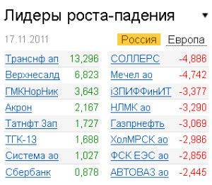 Как и прежде, обеспокоенность игроков вызывают долговые проблемы европейских государств. Во-первых, специалисты агентства Fitch высказали посеявшее уныние среди игроков утверждение, что нынешний кризис в Евросоюзе представляет "серьезную угрозу" для экономики США, особенно для ее банковской системы, которая достаточно сильно интегрирована с европейскими банками. Во-вторых, эксперты другого аналитического агентства - Moody's - поставили рейтинг UniCredit, одного из влиятельнейших банков Италии, на пересмотр с возможностью понижения, и вслед за тем снизили рейтинг дюжине банков государственного сектора Германии. Это решение, по словам представителей агентства, было основано на ожидании того, что данные банки не смогут получить в необходимой мере финансовую поддержку. В-третьих, вслед за размещением бумаг Испанией и Италией аналогичные меры предприняла Франция. Однако на этот раз, как отмечает старший аналитик ИФК "Солид" Эльза Бикчурина, ситуация была иная, и нынешнее размещение немного успокоило трейдеров. Увы, значительного позитива не принес даже и тот факт, что новый итальянский премьер-министр Марио Монти презентовал парламенту программу недавно сформированного правительства по выходу из сложившегося кризиса.