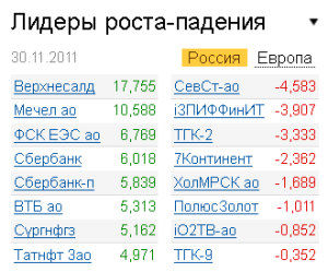 В течение дня укрепил настрой "быков" народный банк КНР, который объявил, что с 5 декабря норма обязательных банковских резервов будет меньше на 50 базисных пунктов. По мнению руководителя аналитической службы ИК "Itinvest-Проспект" Александра Потавина, этот факт говорит о том, что монетарными мерами власти Поднебесной хотят поднять кредитование и поддержать уровень деловой активности, который в стране падает уже несколько месяцев к ряду. На новостях из Европы в течение дня лучше рынка смотрелись бумаги банковского сектора: "префы" "Сбербанка" подорожали на 5,24%, обыкновенные акции и бумаги ВТБ подросли на 6%. Отличным ростом отметились акции "Мечела", которые подорожали на 10,5% и "ФСК ЕЭС" - +7,1%. Аутсайдером дня стали бумаги "Северстали", потерявшие за день 4,8%.