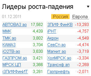В течение дня на ММВБ лучше рынка смотрелись бумаги российских автопроизводителей: "АВТОВАЗ" (+15, 57%), "КАМАЗ" (+3,7%), "СОЛЛЕРС" (+3,19%). Как отмечает начальник дилерского отдела ИК "Файненшл Бридж" Георгий Князев, бумаги "автопрома", имеющие низкую ликвидность и капитализацию, при текущей высокой волатильности рынков вполне способны взлететь даже от прихода на рынок мелкого клиента. В нефтяном секторе по-прежнему лучше рынка смотрелись бумаги "Сургунефтегаза" (+1,05%). В энергетическом секторе повышенным спросом пользовались акции ОГК-1 (+0,4%), чему способствовали данные о чистой прибыли компании по МСФО за 9 месяцев. Среди растущих бумаг также хорошую динамику демонстрировали акции "Сбербанка" (+0,17%) и ВТБ (+1,78%). Слабее рынка выглядели "обычки" "Транснефти" (-2,27%), "префы" "Ростелекома" (-1,09%).