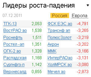 Рынок в течение дня практически не реагировал на позитивные сигналы извне. Политическая нестабильность в стране удерживает внимание инвесторов, а все остальные факторы, влияющие на российские площадки, остаются на втором плане. Хотя, многие эксперты отмечают, что риски, связанные с политической нестабильностью, очень преувеличены. По мнению начальника аналитического управления "Акмос Трейд" Кирилла Тищенко, многочисленные нерезиденты на российском рынке очень нервозно воспринимают ту форму социального протеста, которая наблюдается в столице после парламентских выборов. К тому же, при принятии решений они опираются на мнение собственных, зарубежных СМИ, которые при разборе ситуации склонны сеять панику. Как отмечает Сергей Шалгин, аналитик ФГ "ДОХОДЪ", впервые за последние месяцы события в России оставляют в тени для отечественного фондового рынка вести из-за рубежа.