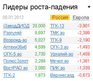 Без сильной поддержки зарубежных индикаторов российские фондовые индексы не смогли в течение дня продемонстрировать уверенный рост. В результате, на закрытии торгов 9 января индекс ММВБ вырос на 0,61% и составил 1449.46 пункта, индекс РТС прибавил 0,45% и составил 1430.13 пункта. В лидерах роста бумаги "ДИОДа" (+20%), "Разгуляя" (+8,69%), "Возрождения" (+5,02%). Наименьшим спросом пользовались акции ТГК-13 (-3,9%), ТМК (-2,39%), ТГК-9 (-2,19%), ОГК-3 (-2,19%).