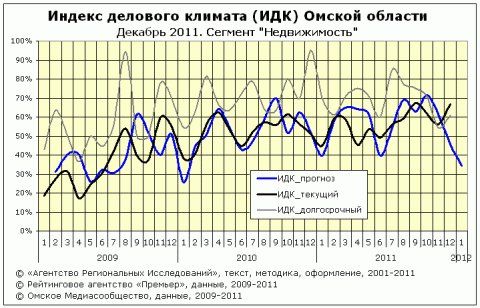 В декабре 2011 года омский Индекс делового климата в секторе "недвижимость" значительно вырос - до 62%. Это проявилось в увеличении количества новых заказов и объемов реализации. В январе 2012 года риэлторы ожидают существенного "спада" активности.