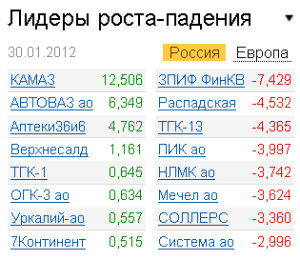 В лидерах роста бумаги "КАМАЗа" (+12,5%) и обыкновенные акции "АВТОВАЗа" (+6,35%). "КАМАЗ" показал столь значительный рост котировок в связи с появлением информации о том, что германский автоконцерн Daimler готов довести свою долю в этой компании до контрольной. Акции "АВТОВАЗа" росли на фоне информации о том, что автомобилестроительный альянс Renault-Nissan в ближайшее время приобретет контрольный пакет акций данного предприятия.