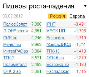 В аутсайдерах торгов в понедельник оказались акции "МРСК Центра и Приволжья" (-1,79%), "ДИОДа" (-1,71%). Хуже рынка смотрелись и акции "Роснефти" (-1,72%), корректирующиеся после роста в пятницу на неплохих финансовых результатах за 2011 год. Также вице-премьер Игорь Сечин выступил с инициативой передать "Роснефти" 25% НМТП, которую ранее планировалось приватизировать.