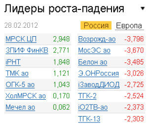 28 февраля был опубликован широкий спектр показателей делового и потребительского климата в ЕС и США, который, по мнению главного экономиста УК "Финам Менеджмент" Александра Осина, в целом оказал поддержку покупкам. Противоречивые новости и ожидание аукциона ЕЦБ не позволили рынкам выбрать определенный тренд. Российские индексы провели день вблизи нулевых отметок. По итогам основной сессии показатель ММВБ опустился на 1.16%, закрывшись на отметке 1574.1пункта, РТС упал на 1.16% и составил 1708.16 пункта.