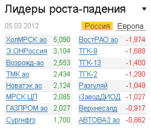 На рынке акций поствыборное ралли нашло отражение прежде всего среди энергетиков: "Холдинг МРСК" (+5,1%), "МРСК Центра и Приволжья" (+2,1%), "Э. ОНРоссия" (+3%). Энергетические бумаги ощутимо подешевели за последний год, а с "новым старым" президентом инвесторы воодушевленно ожидают реформы сектора. Спросом пользовался и нефте-газовые бумаги: "НОВАТЭК" (+2%), "Газпром" (+2%), "Сургутнефтегаз" (+1,7%). "Сбербанк" торгуется на отметке 102 рубля (+0,7%), однако прогнозы экспертов относительно дальнейшего роста этой акции весьма скептичны. Перспективы ВТБ (+1,5%), по мнению аналитиков, также нерадужны. Среди аутсайдеров вновь энергетики (ТГК-9 (-1,7%), ТГК-13 (-1,4%)), помимо них - "Разгуляй" (-1%), "АВТОВАЗ" (-0,9%).