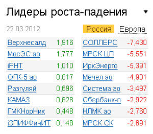 Лидерами роста стали акции ОГК-5 (+0,81), ГМК "Норникель" (+0,56%), "КАМАЗа" (+0,69%). Поддержку бумагам "Норильского никеля" оказала новость о предстоящем строительстве двух горнодобывающих заводов в Красноярском крае общей стоимостью около 20 миллиардов рублей. А совет директоров "КАМАЗа" принял решение минимизировать коррупционные риски, что положительно сказалось на котировках акций автопроизводителя.