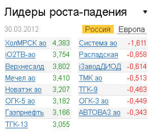В числе значимых корпоративных новостей стоит отметить сообщение "Сбербанка" о том, что в 2012 году компания планирует увеличение прибыли. "За четыре года мы вырастили объем чистой прибыли более чем в 3 раза. И в этом году мы планируем, что наш объем чистой прибыли будет выше, чем в прошлом году. В прошлом году по кредитам физическим лицам наш портфель вырос на 375. Это очень большой рост", - сказал президент, председатель правления "Сбербанка" Г.Греф на встрече с премьер-министром РФ В.Путиным. К закрытию обыкновенные акции "Сбербанка" подросли на 1,21%, "префы" компании прибавили 2,21%. Кроме того, "ЛУКОЙЛ" привлек кредит на $500 миллионов для разработки месторождений в Узбекистане. На этом фоне акции нефтяной компании торговались в "плюсе". К закрытию бумаги "ЛУКОЙЛа" подорожали на 0,16%.