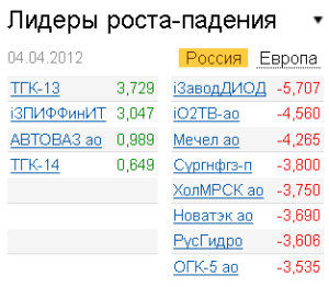 Список аутсайдеров возглавили акции "РусГидро" (-3,33%), "Ростелкома" (-3,5%) и "Сургутнефтегаза" (-3,58%). Бумаги "РусГидро" торгуются на минимальных значениях 2011 года. Возможно, на бумаги давит заявление премьер-министра Владимира Путина по поводу снижения инвестиционной составляющей в тарифе на мощность, сделанное им в декабре прошлого года. Кроме того, на акции повлияла инициатива вице-премьера Игоря Сечина отсрочить сделку компании с Внешэкономбанком. "До завершения формализации стратегии гидрогенерирующей компании по отношению к поглощаемым активам ("РАО ЕЭС Востока", "Иркутскэнерго" и пр.) и сценариев вхождения в уставной капитал "ЕвроСибЭнерго" инвесторы займут выжидательную позицию по отношению к бумагам", - считает аналитик "ТКБ Капитал" Алексей Серов. Падение акций "Сургутнефтегаза" связано с общей тенденцией снижения рынка акций. По мнению директора департамента операций на фондовых рынках "Первого республиканского банка" Игоря Мория, сильного негатива и объективных причин для дальнейшего снижения нет, и акции будут следовать общерыночным тенденциям.
