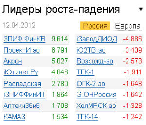Лидерами роста стали акции "Акрона" (+1,63%), "Распадской" (+1,28%), "Аптеки 36,6" (+0,35%). Хорошая динамика была заметна в бумагах "КАМАЗа" (+1,53%), 13 апреля совет директоров компании будет рассматривать соглашение с Daimler. Акции "Газпрома" опустились на 0.15%, несмотря на рекомендации правления компании выплатить дивиденды в размере 8,97 рубля на акцию. Аутсайдерами стали акции банка "Возраждение" (-2,57%), ТГК-1 (-1,91%), "Э.ОН Россия" (-1,64%), "Холдинга МРСК" (-1,33%).