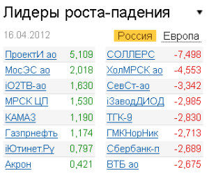 Максимальный рост показали бумаги "Газпром нефти" (+1,17%), "КАМАЗа" (+1,19%). Бумаги автопроизводителя росли на фоне сообщения о росте выручки по РСБУ в 2011 году в 1,5 раза - до 118,598 млрд рублей. Акции электроэнергетического сектора торговались разнонаправленно: рост показали "МРСК Центра и Приволжья" (+3,54%), "Мосэнергосбыт" (+2,69%), снижение - ТГК-2 (- 1,82%), ТГК-13 (-0,84%). Аутсайдерами стали акции "СОЛЛЕРСа" (-7,5%), "Северстали" (-3,34%). Давлению после закрытия реестра 12 апреля продолжают подвергаться бумаги "Сбербанка" - обыкновенные акции банка потеряли 1,99%, "префы" -2,69%. "Бумаги довольно сильно отошли от уровня 100 рублей, что к тому же препятствует приватизации 7,6% пакета в апреле", - отмечает Олег Душин, старший аналитик ИК "Церих Кэпитал Менеджмент". Между тем, как считает первый вице-премьер РФ Игорь Шувалов, отвечающий в правительстве за вопросы управления государственной собственностью, госпакет в размере 7,6% акций "Сбербанка" надо продавать, как и запланировано, в 2012 году.