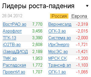 Лидерами рынка стали бумаги "ФСК ЕЭС" (+0,83%), МТС (+0,7%), "Сургутнефтегаз" (+0,61%). Акции "Газпрома" (+0,34%) росли на фоне хорошей отчетности по МСФО за 2011 год. 27 апреля стало известно, что чистая прибыль газового гиганта выросла на 35% - до 1,307 трлн рублей. "Результаты выглядят довольно сильно. Рентабельность по EBITDA превзошла наши прогнозы, свободный денежный поток удалось вывести на положительную территорию. Прогнозы руководства на ближайшие годы озвучены достаточно благоприятные, хотя могут быть и излишне оптимистичными. Беспокойство вызывает рост операционных расходов и налоговой нагрузки. В целом оцениваем отчетность позитивно и ожидаем, что она поддержит котировки в краткосрочной перспективе. Наша оценка справедливой стоимости "Газпрома" - 240 рублей за акцию", - комментируют аналитики UFS.