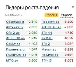 Лидерами роста 3 мая стали привилегированные акции "Сбербанка"(+2,64%), бумаги "ФСК ЕЭС" (+2%), "Северстали" (+1,4%), "Газпрома" (+1,05%). Лучше рынка торговались акции "Полиметалла" (+ 1,05%). Спрос на бумаги был вызван сообщением о том, что совет директоров Polyus Gold International Limited одобрил дивидендную политику, согласно которой компания будет направлять на выплату дивидендов минимум 20% годовой чистой прибыли по МСФО.