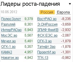 В лидерах роста пребывали бумаги "Разгуляя" (+8,3%), "ИНТЕР РАО" (+5,9%) и ОГК-1 (+5,3%). Чистая прибыль "КАМАЗа" (+4,9%), поддержавшая котировки компании, в 2011 году по МСФО выросла до 1,8 млрд рублей против убытка годом ранее. Акции "Полюс Золото" сегодня неожиданно продемонстрировали рост более чем на 9%.