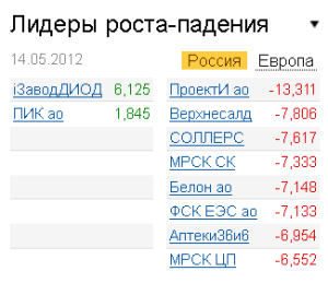 В аутсайдерах торговались бумаги "СОЛЛЕРСа", "МРСК Центра и Приволжья", "Распадской". И.о. вице-премьера РФ Игорь Сечин сообщил, что "Холдинг МРСК" и "ФСК ЕЭС" в дальнейшем предполагается объединить в национальную сетевую компанию. Котировки компаний снова закрылись в "красной зоне" (-5,3% и -7,22% соответственно). Стали известны финансовые результаты "Э.ОН Россия": чистая прибыль компании в 1 квартале 2012 года по РСБУ выросла на 14%, до 5,18 миллиарда рублей. Но, несмотря на отчетность, акции "Э.ОН Россия" закрылись снижением (-5,3%).
