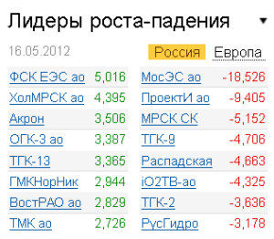 В лидерах роста оказались акции сектора электроэнергетики. Бумаги "Холдинга МРСК" и "ФСК ЕЭС" отыгрывали недавнее опережающее падение из-за новостей, связанных со скорым объединением компаний. К концу торгов акции даже выбились в лидеры роста: бумаги "Холдинга МРСК" прибавили 4,39%, "ФСК ЕЭС" выросли на 5,01%. Поддержку последним оказывало также закрытие реестра, назначенное на 16 мая. Кроме того, в список фаворитов по итогам основной сессии вошли акции ОГК-3 (+3,38%), ТГК-13 (+3,36%), "ИНТЕР РАО ЕЭС" (+1,65%), "РАО ЭС Востока" (+2,83%). Бумаги "ИНТЕР РАО" были поддержаны новостью о том, что в результате полугодового пересмотра индекса MSCI Russia Standard в нем повысился вес акций сетевой компании. На фоне этой новости вечернее сообщение о том, что компания может не выплатить дивиденды по итогам 2012 года пока осталось незамеченным игроками. Наряду с акциями "ИНТЕ РАО ЕЭС" в индексе повышен вес бумаг "Роснефти" (+1,22%), "Группы ЛСР" (+4,13%). Вес акций "Ростелекома" (-0,54%), наоборот, снижен.