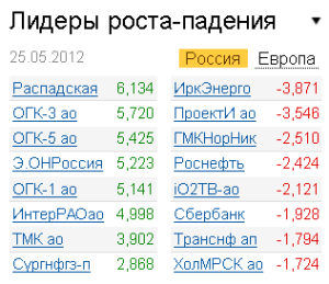 Лидерами роста стали акции "Распадской" (+6,13 %), "ИНТЕР РАО ЕЭС" (+4,99%), "Э.ОН Россия" (+5,22%), ОГК-5 (+5,42%), ОГК-3(+5,72%). Хорошую динамику продемонстрировали бумаги "Газпрома"(+ 0,59%), которые UBS добавил в топ-список по бумагам развивающихся рынков. Также поддержку оказали заявления в отношении Штокмана: глава Statoil, одного из участников проекта, надеется, что прогресс будет достигнут к Петербургскому международному экономическому форуму, отмечает г-жа Лесина.