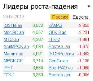 28 мая Минэкономразвития представило данные по ВВП в апреле 2012 года. По оценке МЭР, в апреле текущего года ВВП с исключением сезонного фактора снизился на 0,1% по сравнению с мартом (снижение составляло также 0,1%). Падение в апреле вызвано в основном динамикой промышленного производства, со стороны спроса - снижением инвестиций. Отток капитала из России продолжается, несмотря на прогнозы ЦБ РФ. На российском рынке акции взяли передышку, и росли в рамках коррекции. Бумаги "Холдинга МРСК" (+4%), "ФСК ЕЭС" (+1,78%), АФК "Система" (+3,07%). Бумаги "Магнита" пользовались спросом, поднявшись на 4%. Среди лидеров повышения стоит выделить также акции МТС (+4,27%). Акции эмитента на фоне отскока смогли закрыть гэп от 11 мая 2012 года, поднявшись выше уровня 225 рублей.