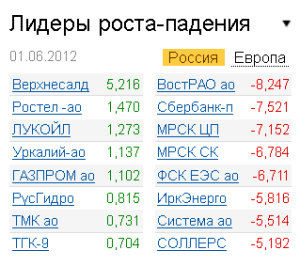 Снижению способствовал обвал акций "Сбербанка". Инвесторы негативно отреагировали на сообщения о том, что банк не планирует проводить обратный выкуп акций и не рассматривает вопрос о конвертации привилегированных акций в обыкновенные. Решение акционеров об утверждении дивидендов по итогам 2011 года в размере 2,08 рубля на одну обыкновенную и 2,59 рубля на одну привилегированную акцию не вернуло покупателей. По итогам сессии "префы" банка снизились на 7,52%, обыкновенные акции - на 3,46%. Аутсайдерами торгов стали акции "РАО ЭС Востока"(- 8,24%), "МРСК Центра и Приволжья" (-7,15%), "ФСК ЕЭС" (-6,71%), "СОЛЛЕРСа" (-5,19%). Лидерами роста стали акции "Ростелекома" (+1,47%), "ЛУКОЙЛа" (+1,27%), "Уралкалия" (+1,14%), "Газпрома" (+1,1%), "РусГидро" (+0,81%).