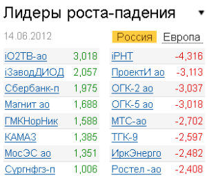 Аутсайдерами торгов стали бумаги МТС (-2,7%), "Ростелекома" (-2,41%), "ИНТЕР РАО ЕЭС" (-1%). Бумаги "Ростелекома" начали терять в капитализации после открытия ГОСА компании. На собрании была одобрена выплата дивидендов за 2011 год в размере 4,6959 рубля на акцию. При этом миноритарии "Ростелекома" считают, что акции компании недооценены в три раза, о чем и заявили на ГОСА. Акции госэнергохолдинга снижаются третью сессию подряд. В четверг распродажам способствовало сообщение об отсрочке добровольной оферты на выкуп акций "Башкирэнерго". Кроме того, бумаги сектора электроэнергетики продолжают терять доверие инвесторов по мере того, как наступает разочарование относительно перспектив отрасли.