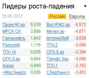 Хуже рынка выглядели акции "РАО ЭС Востока" (-5,57%), "Мечела" (-4,67%), "Татнефти" (-3,09%), ТГК-2 (-3,59%). Начальник отдела доверительного управления "Абсолют Банка" Иван Фоменко считает, что снижение акций электроэнергетических компаний вызвано сообщение о том, что план по приватизации "ФСК ЕЭС" может быть отложен в случае рецессии, что негативно отражается на всем секторе. Бумаги самого "ФСК ЕЭС" по итогам сессии прибавили 0,07%. 25 июня акционеры "ИНТЕР РАО ЕЭС" в связи с убытком компании за 2011 год в размере 143,1 миллиарда рублей приняли решение не выплачивать дивиденды по обыкновенным акциям по итогам года, но это сообщение не имело сильного воздействия на котировки: бумаги компании по итогам сессии выросли на 0,11%.