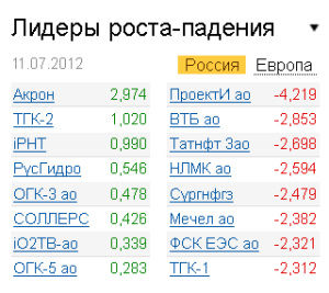 Лидерами повышения стали акции "РусГидро" (+0,55%), ОГК-5 (+0,28%), "префы" "Холдинга МРСК" (+1,46%). Акции "РусГидро" продолжают отыгрывать итоги прошедшего вчера первого президентского заседания по ТЭК. "Приватизация "РусГидро" и "ИНТЕР РАО ЕЭС" пройдет с участием "Роснефтегаза", который в итоге может получить в гидрогенерирующей компании более 70% акций, а в "ИНТЕР РАО ЕЭС" - блок-пакет. Причем, по словам как Владимира Путина, так и Игоря Сечина, текущая стоимость "РусГидро" ($7,5 миллиарда) занижена, и через несколько лет с окончанием крупных проектов компания будет стоить в пять раз дороже - $40 миллиардов. Именно поэтому, как отметил Сечин, "вхождение в капитал "РусГидро" имеет смысл". На фоне этих заявлений вчера и сегодня "РусГидро" - лидеры роста среди наиболее ликвидных акций", - комментирует Александр Парфенов, аналитик "Унисон Капитал".
