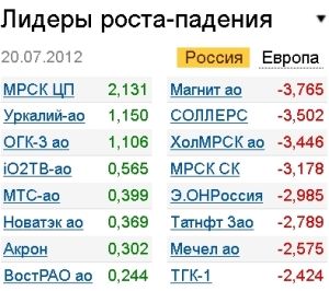 Днем 20 июля коррекционные настроения усилились – российские индикаторы опустились еще ниже, следуя за европейскими площадками. В итоге к закрытию индекс ММВБ снизился на 1,33% и составил 1415,38 пункта, а индекс РТС опустился на 1,59% - до отметки 1391,55 пункта. "Российские фондовые площадки в пятницу, не смотря на значительные продажи за рубежом и падение цен на нефть, чувствовали себя лучше европейских рынков, судя по всему, находясь в ожидании скорого возобновления покупок. Однако нельзя исключать, что в начале следующей недели, в условиях отсутствия значимых макроэкономических данных из-за рубежа, коррекционное снижение продолжится", - предположила аналитик "АТОН" Елена Кожухова.