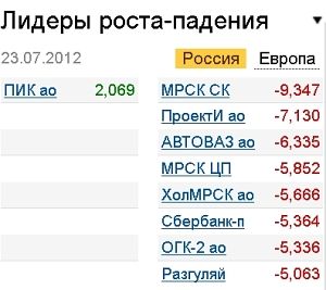 По итогам дня аутсайдерами торгов стали бумаги "Холдинга МРСК" (обыкновенные -5,67%, "префы" -5,5%), "Сбербанка" (обыкновенные -4,57%, "префы" -5,36%), "Северстали (-4,96%), "РусГидро" (-4,94%), "ВТБ (-4,73%), НЛМК (-4,32%), ММК (-4,12%), "Татнефти" (-3,93%), "Иркутскэнерго" (-3,9%), "Ростелекома" (обыкновенные -3,81%, "префы" -3,86%). Лидерами повышения стали акции "ПИКа" (+2%), и "ГАЗа" (+1,7%).