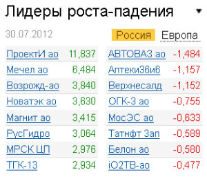 По итогам дня лидерами роста стали акции "Мечела" (+6,48%), Банка "Возрождение" (+3,84%), "НОВАТЭКа" (+3,63%). Акции "Магнита" продолжили расти на сильной отчетности (+3,41%), по мнению аналитиков, потенциал роста данных бумаг все еще не исчерпан. Бумаги "РусГидро" прибавили 3,06%, акции ВТБ выросли на 2,31%, хороший рост показали бумаги "Роснефти" (+2,26%) и "Северстали" (+2,18%) Динамику хуже рынка показали акции "МТС" (+0,2%) и "АВТОВАЗа" (-1,48%), ранее в течение нескольких дней демонстрировавшие опережающий рост. Бумаги "Аптечной сети 36,6" в "минусе" на 1,16%, "ФСК ЕЭС" - на 0,08%, акции "Холдинга МРСК" снизились в цене на 0,75%, "Ростелекома" - на 0,47%.