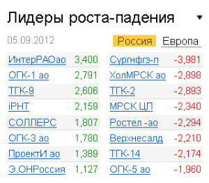 Лидерами повышения цен стали акции "ИНТЕР РАО ЕЭС" (+3,4%), ОГК-1 (+2,79%), ТГК-9 (+2,6%), "СОЛЛЕРСа" (+1,8%), ОГК-3 (+1,78%), "префы" "Башнефти" (+1,91%).