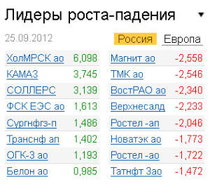 По итогам дня индекс ММВБ опустился на 0,49% - до уровня 1482,61 пункта, РТС финишировал в плюсе 0,09% на отметке 1510,96 пункта. Аутсайдерами дня стали акции "Магнита" (-2,5%), ТМК-1 (-2,5%), "РАО ЕЭС Востока" (-2,3%) и "НОВАТЭКа" (-1,7%), "Ростелекома" (-1,7%). Лучше рынка выглядели в четверг бумаги "МРСК Холдинга" (+6%), "КАМАЗа" (+3,7%), "СОЛЛЕРСа" (+3,1%), "ФСК ЕЭС" (+1,6%), "префы" "Сургутнефтегаза" (+1,48%), "Транснефти" (+1,4%).