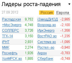 В лидерах роста оказались акции "Распадской" (+9,75%), "Мосэнерго" (+4,75%), "СОЛЛЕРСа" (+3,73%), ТГК-14 (+3,15%), ММК (+2,27%), "Роснефти" (+1,92%), "Холдинга МРСК" (+1,88%). Динамику лучше рынка на фоне роста нефтяных цен продемонстрировали обыкновенные акции "Татнефти" (+1,79%). 28 сентября влияние на котировки бумаг эмитента может оказать заседание совета директоров компании, одним из вопросов которого будет рассмотрение прогнозов финансово-хозяйственной деятельности на 2013 год.