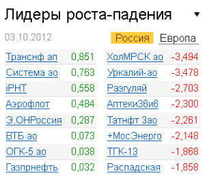 В лидерах падения оказались акции "Холдинга МРСК " (-3,49%), "Уралкалия" (-3,48%), "Татнефти" (-2,26%), "Мосэнерго" (-2,14%), ТГК-13 (-1,88%). Лучше рынка смотрелись "префы" "Транснефти" (+0,85%), АФК "Система" (+0,76%), "Аэрофлота" (+0,48%), ВТБ (+0,07%), ОГК-5 (+0,04%).