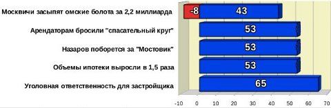 Следующие три позиции получили одинаковый уровень важности - 53% и, к тому же, дружно расположились в "синей зоне". Расстановку новостей определили сотые доли баллов. Несмотря на положительные оценки новости о росте объемов ипотечного кредитования, эксперты настроены довольно критично: "при низком уровне средней заработной платы ипотека загоняет людей в долговременную кабалу, и ситуация к лучшему пока не меняется".