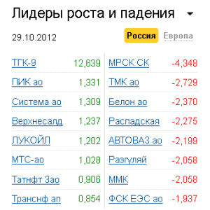 Наиболее сильное снижение наблюдалось в акциях "МРСК Северного Кавказа" (-4,35%), ТМК (-2,73%),"Распадской" (-2,28%), "АВТОВАЗа" (-2,2%), "Разгуляя" (-2,06%), ММК (-2,06%), "ФСК ЕЭС" (-1,94%). Акции ТНК-ВР снизились на 0,54% - компания представила финансовые результаты за 9 месяцев по РСБУ, согласно которым ее чистая прибыль по сравнению с аналогичным периодом прошлого года сократилась на 24%. Бумаги "Роснефти" снижались наравне с рынком (-0,5%).
