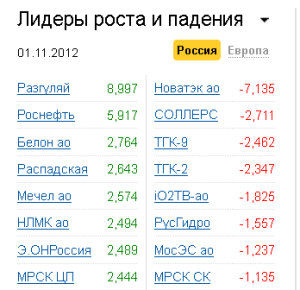 Среди лидеров повышения - акции "Разгуляя", выросшие на 8,99% на фоне хорошей отчетности за 9 месяцев, а также новости о продаже "Кондопожского комбината хлебопродуктов"; бумаги "Распадской" (+2,64%), "Мечела" (+2,57%), НЛМК (+2,49%). Бумаги "Роснефти" продолжают стремительный рост (+5,9%); дополнительную поддержку акциям оказала отчетность компании за 3 квартал. Так, чистая прибыль компании за указанный период достигла рекордного за последние пять лет значения и составила 181 миллиард рублей.