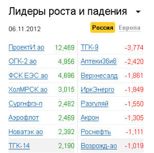 Наиболее сильно смотрелись акции нефтегазового сектора - "ЛУКОЙЛ" подрос на 0,51%, "префы" "Сургутнефтегаза" прибавили 2,48%%, "Татнефть" в "плюсе" на 1,34%, "НОВАТЭК" - на 2,39%. Также среди лидеров повышения стоит отметить акции "ФСК ЕЭС" (+4,97%) и "Холдинга МРСК" (+3,01%). Позитивное влияние на их котировки оказала новость о том, что Министерство энергетики России направило Владимиру Путину новый проект объединения сетевых активов. Так, согласно письму Минэнерго, консолидация правительственной доли "ФСК ЕЭС" произойдет на базе "Холдинга МРСК". Новая объединенная компания будет названа "Российские сети". Росли также акции "Аэрофлота" (+2,47%) и "АВТОВАЗа" (+2,03%).