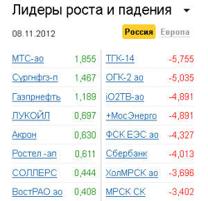 Таким образом, минорные настроения российских инвесторов обусловили неутешительные итоги сессии: индекс ММВБ финишировал на отметке 1407,79 пункта, снизившись на 1,09%, РТС просел на 1,1%, опустившись к закрытию основной сессии к отметке 1410,27 пункта. Правда, позитивное открытие заокеанских бирж придало силы и отечественным "быкам", которые своими покупками под занавес торгов сумели немного приподнять индексы, но полностью отыграть негатив дня, конечно, за несколько минут было нереальным. Лидерами падения оказались бумаги ТГК-14 (-5,7%), ОГК-2 (-5%), "Сбербанка" (-4%), "ФСК ЕЭС" (-4,3%), "МРСК Холдинга" (-3,9%). В числе лидеров роста - акции МТС (+1,8%), "Газпром нефти" (+1,1%), "ЛУКОЙЛа" (+0,69%), "префы" "Сургутнефтегаза" (+1,4%).