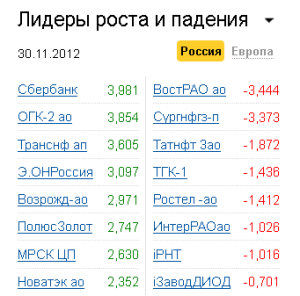 Много новостей поступало от "Роснефти". Акционеры компании на внеочередном собрании в пятницу утвердили решение о выплате дополнительных дивидендов за 2011 год в размере 4,08 рубля на акцию. Таким образом, общая дивидендная доходность по бумагам компании за прошлый год составит примерно 3,6%. Поспособствовало росту котировок и заявление президента компании Игоря Сечина о том, что в декабре "Роснефть" может подписать обязывающее соглашение с ААР о покупке оставшихся 50% ТНК-BP. Кроме того, компания объявила о намерении сохранить бренды компании ТНК-BP при слиянии. "Фундаментально акции компании остаются привлекательными. Перспективы хорошие, особенно, учитывая сделку по покупке ТНК-ВР и увеличение в связи с этим технических мощностей. Это будет еще длительное время оказывать позитивное влияние на акции "Роснефти", - считает Иван Фоменко, начальник отдела доверительного управления "Абсолют Банка".