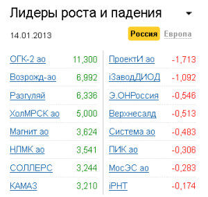 Среди лидеров роста обозначились акции металлургического сектора: НЛМК (+3,54%), ММК (2,62%), "Северстали" (1,51%). Росли бумаги "Возрождения" (+5,08%), "Холдинга МРСК" (+5%), "Аэрофлота" (+3,19%), "Магнита" (3,62%), "КАМАЗа" (3,21%), "ФСК ЕЭС" (2,52%).