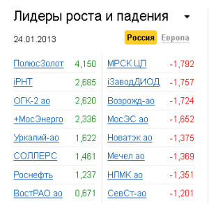 Среди лидеров падения отметились такие акции как "Возрождение" (-1,72%), "НОВАТЭК" (-1,37%) "Мечел" (-1,37%), НЛМК (-1,35%), "Северсталь" (-1,2%). Среди лидеров роста - бумаги "Мосэнерго" (+2,33%), "Уралкалия" (+1,62%), "СОЛЛЕРСа" (+1,46%), "Роснефти" (+1,24%). Акции "Полюс Золото" выросли на 4,15% на новости о том, что акционеры группы "ОНЭКСИМ" Михаила Прохорова готовы продать свой пакет из 37,78% акций Polyus Gold International Limited за 3,6 миллиарда долларов. В моменте бумаги прибавляли в цене 8%, однако к закрытию торгов часть игроков предпочли зафиксировать прибыль.
