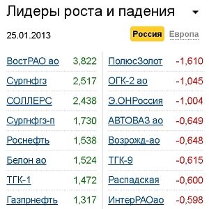 На российском фондовом рынке в пятницу, 25 января, "быки" смогли одолеть "медведей" и вывести отечественные индикаторы в небольшой плюс. Поддержку площадкам оказали растущие нефтяные котировки. Негативным фактором для рынка стал находящийся в "красной зоне" фьючерс на индекс S&P, но к середине сессии цвет индикатора сменился на зеленый. Во второй половине дня мировые площадки продолжили торговаться на достигнутых уровнях, что было обусловлено слабым информационным фоном - значимых макроданных из-за рубежа уже не выходило. К концу сессии индекс ММВБ поднялся на 0,67% до 1544,02 п., индекс РТС вырос на 0,88% до 1618,84 п..
