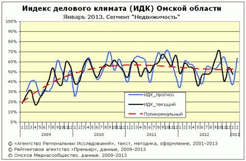 Индекс делового климата (ИДК) представляет собой усредненную экспертную оценку динамики состояния экономики (и ее сегментов), а также ожидаемых направлений развития рыночной ситуации. Индекс вычисляется на основе опроса экспертов. Значение ИДК может варьировать от 0% (полный спад) до 100% (бурное развитие). При интерпретации результатов замеров следует учитывать, что значения ИДК выше 50% соответствуют росту, а ниже 50% - падению соответствующих параметров. Очередной раунд построения ИДК выполнялся специалистами рейтингового агентства "Премьер" совместно с аналитиками Агентства Региональных Исследований путем опроса экспертов двух рыночных сегментов, моделирующих региональный рынок, - недвижимости и медиа.