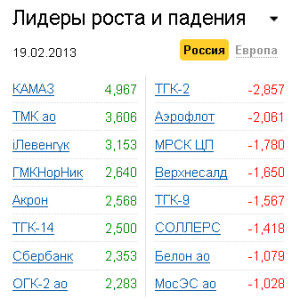 Среди аутсайдеров оказались ТГК-2 (-2,86%), "Аэрофлот" (-2,06%), "МРСК Центра и Приволжья" (-1,78%), ТГК-9 (-1,57%) и "СОЛЛЕРС" (-1,42%).