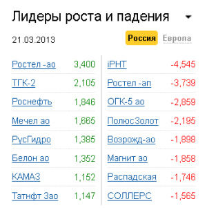 Аутсайдерами рынка стали "префы" "Ростелекома" (-3,73%), акции ОГК-5 (-2,85%), "Полюс Золото" (-2,19%), банка "Возрождение" (-1,89%), "Магнита" (-1,85%), "СОЛЛЕРСа" (-1,56%).