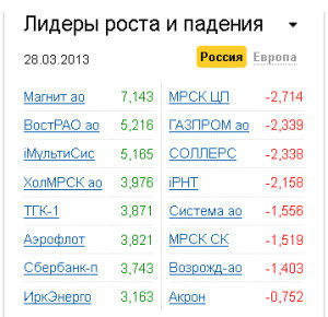 В первой половине дня вниз отечественный рынок тянули снижающиеся акции "Газпрома" (-2,34%), чья прибыль согласно отчетности по РСБУ упала на 37%, таким образом, размер дивидендов компании за 2012 год составит примерно 6 рублей на акцию. Также добавила негатива и информация о том, что в "дочке" "Газпрома" проводятся обыски из-за неуплаты налогов на сумму 182 миллиона рублей.