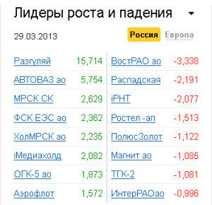 Одними из самых ликвидных бумаг стали акции "Аэрофлота" (+1,57%) и "АВТОВАЗа" (+5,75%) без каких-либо значимых на то причин. Кроме того, была опубликованная чистая прибыль "Аэрофлота" по РСБУ в 2012 году, которая упала на 52,9% - до 4,9 миллиардов рублей, но эта новость не смогла понизить позитив в бумагах. В плюсе в пятницу были и акции "Газпрома" (+0,68%), на динамику которых повлияли новости о повышении спроса на газ в Европе.