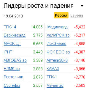 Хуже остальных смотрелись бумаги электроэнергетического сектора: "Холдинг МРСК" (-5,22%), "ФСК ЕЭС" (-4,37%), "РусГидро" (-2,33%)", "ИНТЕР РАО" (-1,58%), РАО ЭС Востока" (-0,04%). Также снижались акции "Иркутскэнерго" (-4,69%), "Аптечной сети 36и6" (-3,14%), "Мечела" (-2,5%).